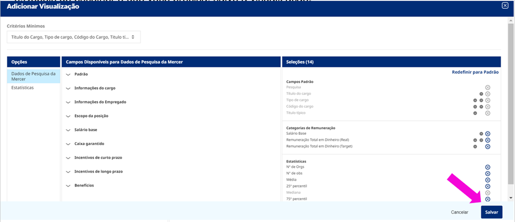 Na coluna "Campos Disponíveis para Dados de Pesquisa da Mercer", você pode selecionar itens de remuneração individualmente.